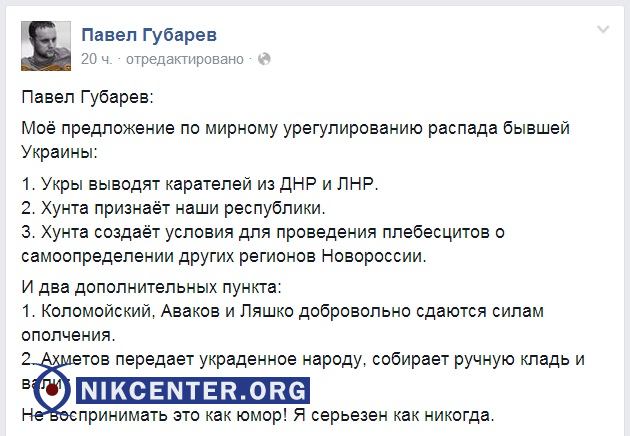 В ответ на мирный план Порошенко, глава общественной организации «Народное ополчение Донбасса» Павел Губарев выдвинул свои требования. Их бизнесмен разместил на своей странице в Фейсбуке.