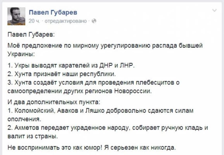 В ответ на мирный план Порошенко, глава общественной организации «Народное ополчение Донбасса» Павел Губарев выдвинул свои требования. Их бизнесмен разместил на своей странице в Фейсбуке.