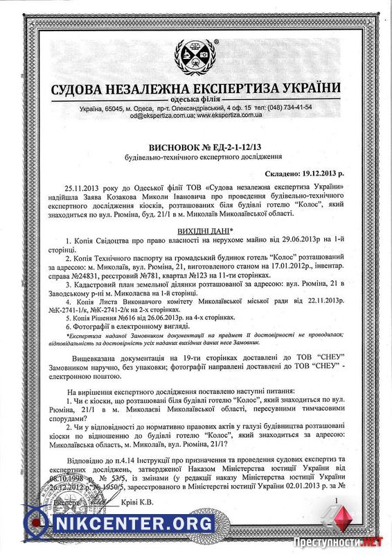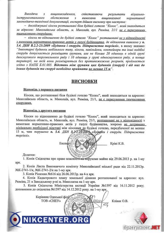 Но эти предприниматели вместо временных передвижных сооружений разместили там настоящие МАФы, о чем свидетельствует заключение № ЕД-2-1-12/13 судебной независимой экспертизы Украины. Всего только по улице Рюмина предприниматели Хоменя и Кравцов установили 24 МАФа вместо передвижных временных сооружений. Хозяин гостиницы «Колос», возле которой установили МАФы, указанное решение исполкома обжаловал в Хозяйственном суде Николаевской области (дело № 915/118/14) и задался вопросом, каким образом этим предпринимателям предоставляются привилегии.