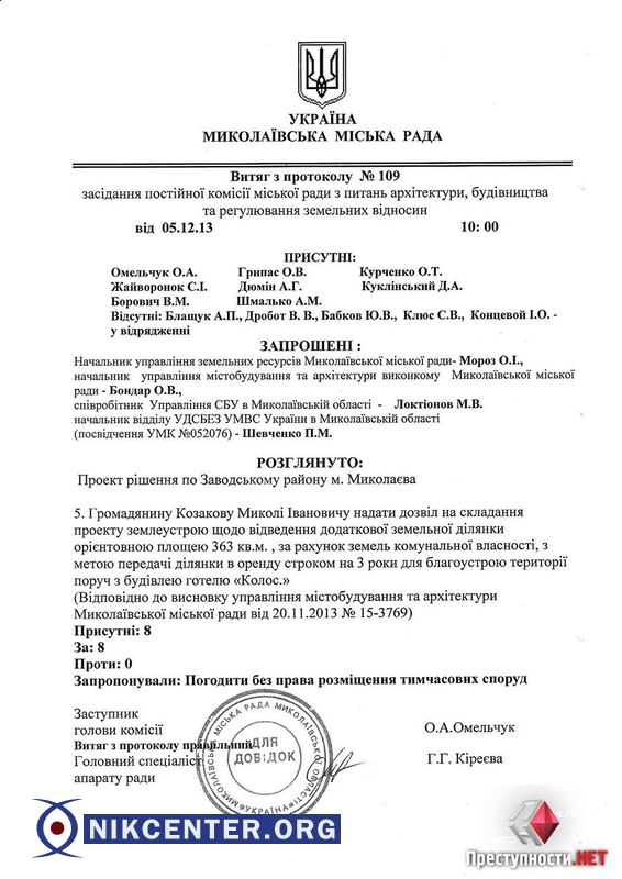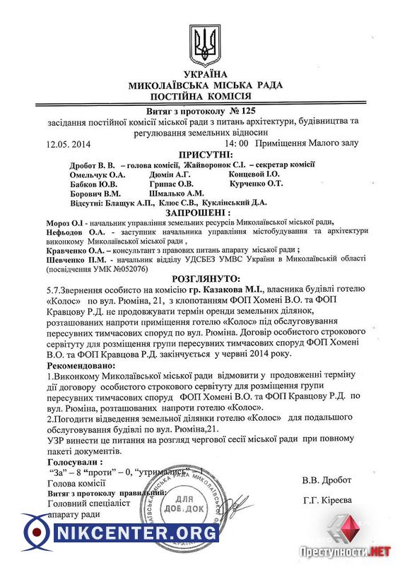 Так, по информации Казакова, 26 июня 2013 года исполнительный комитет Николаевского городского совета (прошлого состава) «руководствуясь собственными соображениями» и без выводов депутатской постоянной комиссии городского совета по вопросам архитектуры, строительства и регулирования земельных отношений принял решение № 616. Таким образом, исполком утвердил техническую документацию по установлению границ личного срочного сервитута для размещения передвижных временных сооружений по улице Рюмина предпринимателям В. Хомене и Р. Кравцову.