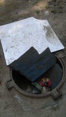 Как рассказывают жильцы, во дворе все канализационные ямы находятся без люков, а канализация забита разным строительным и бытовым мусором. Так как во дворе проживает более 15 семей с маленькими детьми, открытые люки являются потенциальной опасностью для гуляющих во дворе мамочек с детками, ведь невозможно отпустить своего ребенка поиграть.