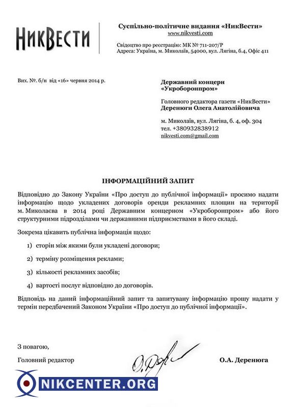 Государственный концерн «Укроборонпром» отказал редактору интернет-издания «НикВести» (г.Николаев) Олегу Деренюзи в получении информации о расходах на рекламу его руководителя Юрия Терещенко. Об этом сообщает региональный корреспондент Института массовой информации (ИМИ).