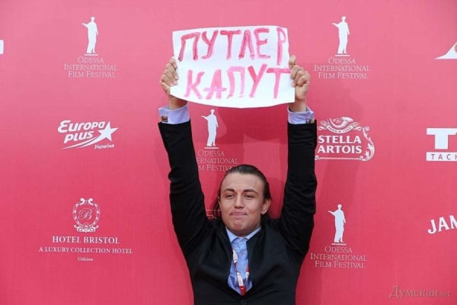 На красную дорожку во время открытия Одесского международного кинофестиваля выбежал молодой человек с самодельым плакатом с надписью "Путлер капут!". Несколько секунд он скандировал лозунг "Путин капут!", после чего оставил дорожку под вспышки фотокамер.