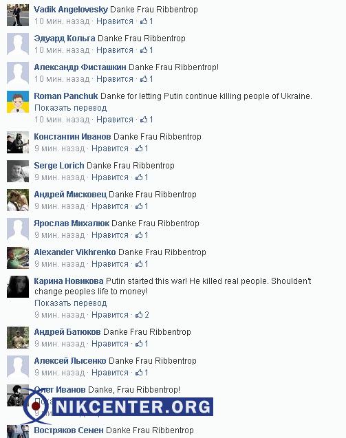 Наиболее часто попадающимся комментарием является "Danke Frau Ribbentrop", что переводится как "Спасибо, фрау Риббентроп". Таким образом, пользователи акцентируют внимание на противоречивой исторической фигуре экс-министра иностранных дел Германии (1938-1945 гг.), советника Адольфа Гитлера по внешней политике.