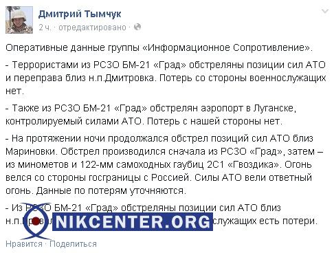 "На протяжении ночи продолжался обстрел позиций сил антитеррористической операции (АТО) близ Мариновки. Обстрел производился сначала из РСЗО Град, затем – из минометов и 122-мм самоходных гаубиц 2С1 Гвоздика. Огонь велся со стороны госграницы с Россией. Силы АТО вели ответный огонь. Данные по потерям уточняются", — написал Тымчук на своей странице Facebook.