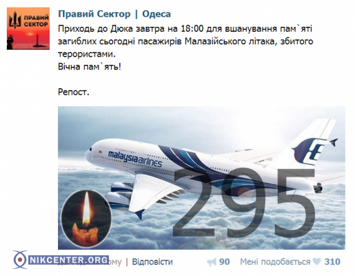 Призыв собраться и почтить память 295 жертв авиакатастрофы размещен на страничке одесского «Правого сектора» в социальной сети.