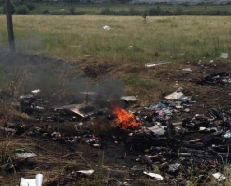 На месте падения Боинга начался пожар. Горят вещи погибших
