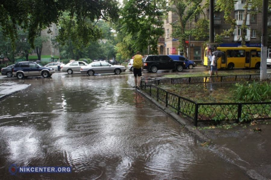 Из-за утреннего дождя в Одессе затопило улицы. В частности, на проспекте Шевченко вода залила проезжую часть и тротуары.