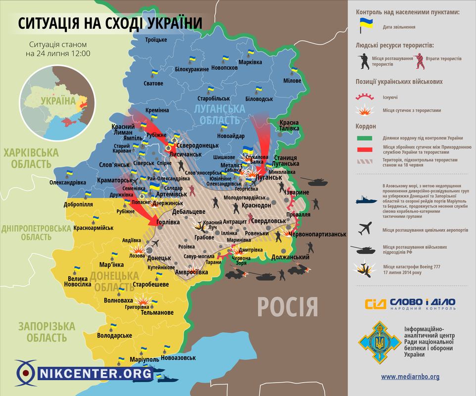 Кроме того, по данным информцентра СНБО, изартиллерийского оружия были обстреляны позиции сил АТО в районе Мариновки, из стрелкового оружия и гранатометов — блокпосты вблизи Северодонска и Смолянинова, из минометов обстреляли блокпост недалеко от Авдеевки.