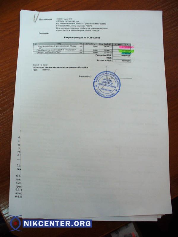 Частное предприятие, у которого хотели медики закупить спецоборудование по искусственно завышенным ценам, оформлено на Александра Фичиджи. Фирма этого предпринимателя являлась николаевским посредником киевских первичных поставщиков, на которых совершенно случайно удалось выйти Янишевской и закупить у них аппараты.