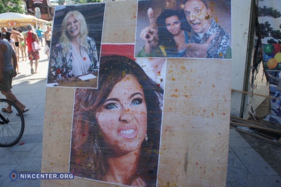 Активисты принесли с собой стенд с фотографиями нежелательных гостей и гнилые овощи и фрукты. Каждый желающий мог подойти и бросить гнилью в фото Ани Лорак, Потапа и Насти Каменских и Таисии Повалий – именно они попали в черный список предателей страны: