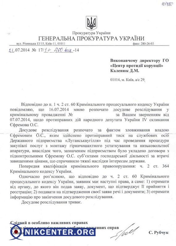 "Генеральная прокуратура Украины открыла уголовное дело против председателя фракции Партии Регионов в Верховной Раде Александра Ефремова. Его обвиняют в злоупотреблении властью и противоправном давлении на должностных лиц с целью получения материальной выгоды. Согласно ч. 2 ст. 364 Уголовного кодекса Украины, ему грозит лишение свободы от 3 до 6 лет", — говорится в сообщении организации.