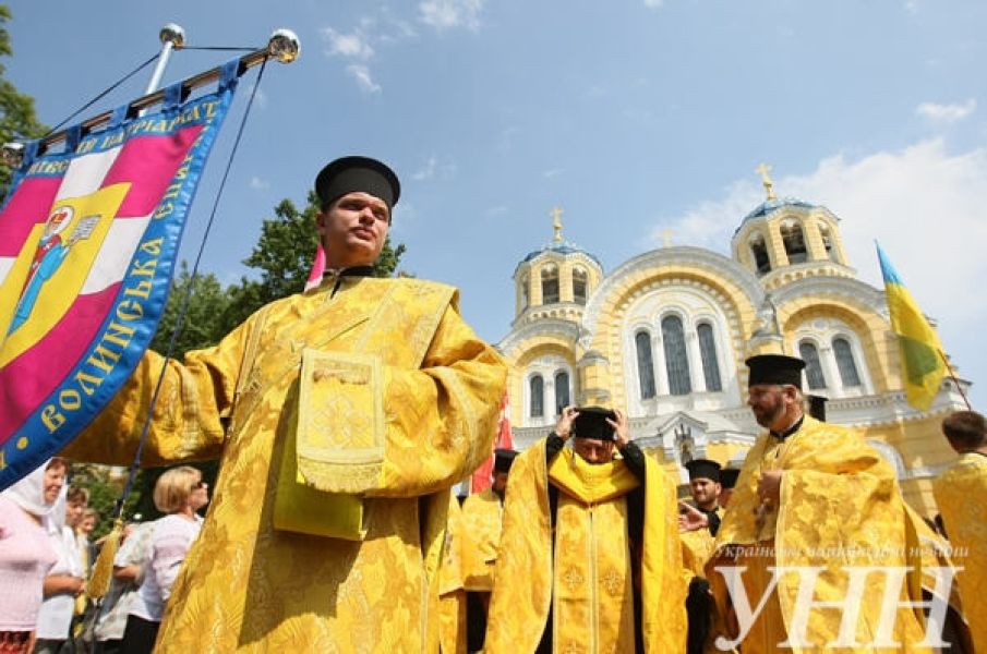 После завершения литургии начался крестный ход от Владимирского собора. Через бульвар Шевченко, улицы Владимирскую и Трехсвятительскую до Владимирской горки прошли сотни священнослужителей и тысячи верующих. В течение шествия они пели религиозные песни, читали молитвы и время от времени скандировали патриотические лозунги.