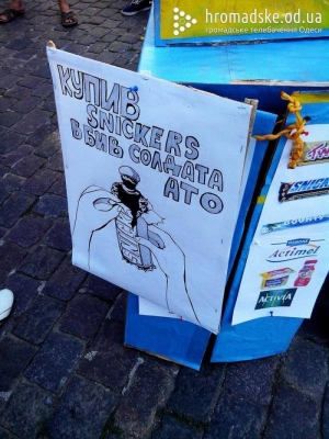 На прошлой неделе прошел первый флеш-моб в центре города под лозунгом «Купил «Сникерс» — убил солдата АТО»: