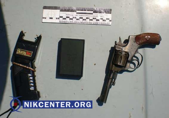 В присутствии свидетелей правоохранители осмотрели транспортное средство и содержимое сумки. Как выяснилось, мужчины направлялись из Днепропетровской области в г. Николаев, имея при себе «небольшой» арсенал оружия: устройство для стрельбы, который по своим признакам напоминает огнестрельное оружие (револьвер 1943 года выпуска) с патронами в барабане, электрический шокер, а под водительским сиденьем была спрятана деревянная палка, которая тоже имеет признаки холодного оружия.