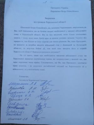 «Заявления о необходимости введения военного положения на Херсонщине считаем политическими играми, недопустимыми в трудное время, которое переживает наша страна. Надеемся, что Вы, господин Президент, примете верное решение и не допустите» дестабилизации ситуации на Херсонщине ни в военном, ни политическом плане», — сказано в обращении херсонцев к Президенту Украины (смотрите фото, оно кликабельно).