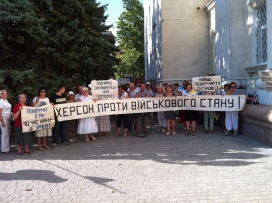В среду, 30 июля в Херсоне на площади Свободы состоялось сразу два митинга, на которых херсонцы якобы высказывались как за, так и против введения военного положения. Причем первый митинг инспирирован нынешней властью в регионе, а второй — их коллегами по Майдану. Но они хотя и коллеги, а договориться как и раньше не умели, так и сейчас не хотят.