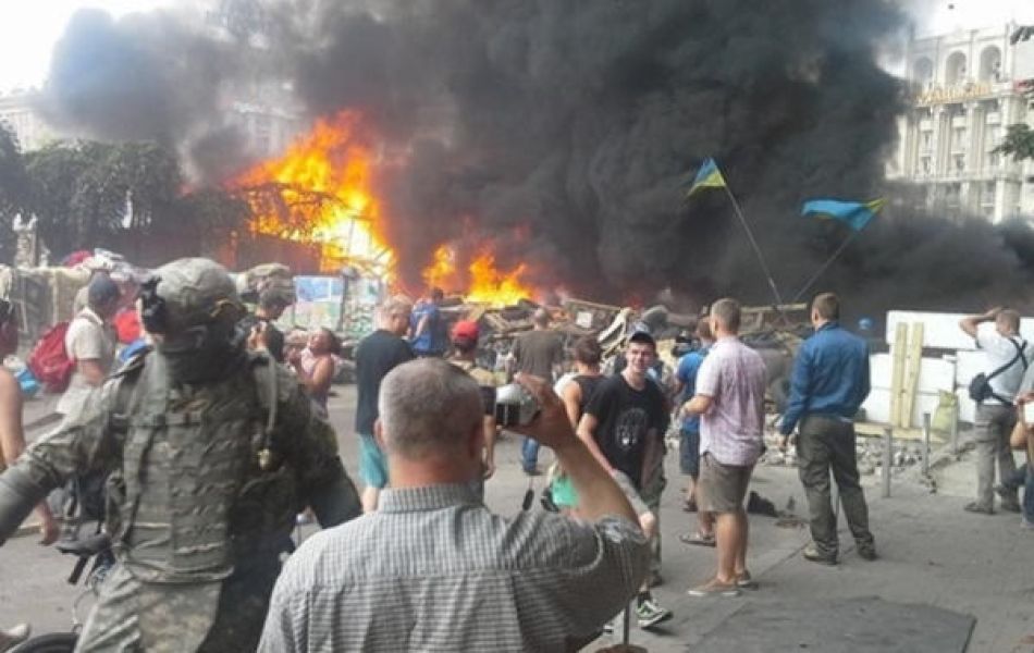 "Кто-то бросил коктейль Молотова. Осколками порезало ноги нескольким фотокорреспондентам. Палатки сносят возле елки. Со стороны Дома профсоюзов валит большой черный дым. Горят палатки и шины. Дымом уже заволокло гостиницу Днепр", — передает издание.