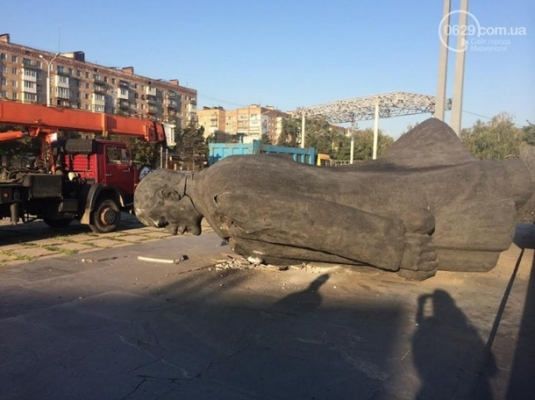В Мариуполе сегодня ночью неизвестные с помощью троса снесли с постамента восьмиметровый памятник Ленину, расположенный в центре города.
