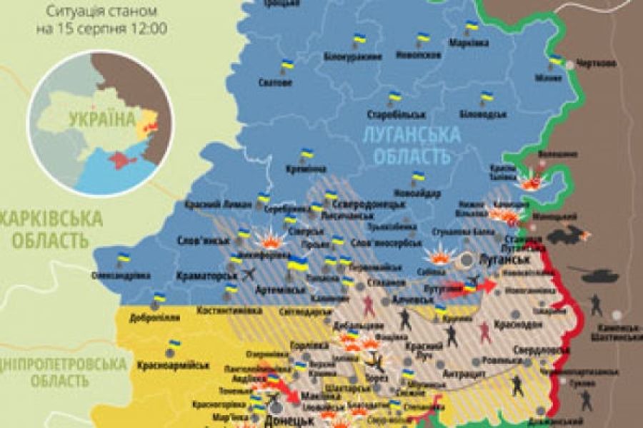 Совет национальной безопасности и обороны Украины опубликовал актуальную карту боевых действий в зоне АТО по состоянию на 15 августа, 12:00.