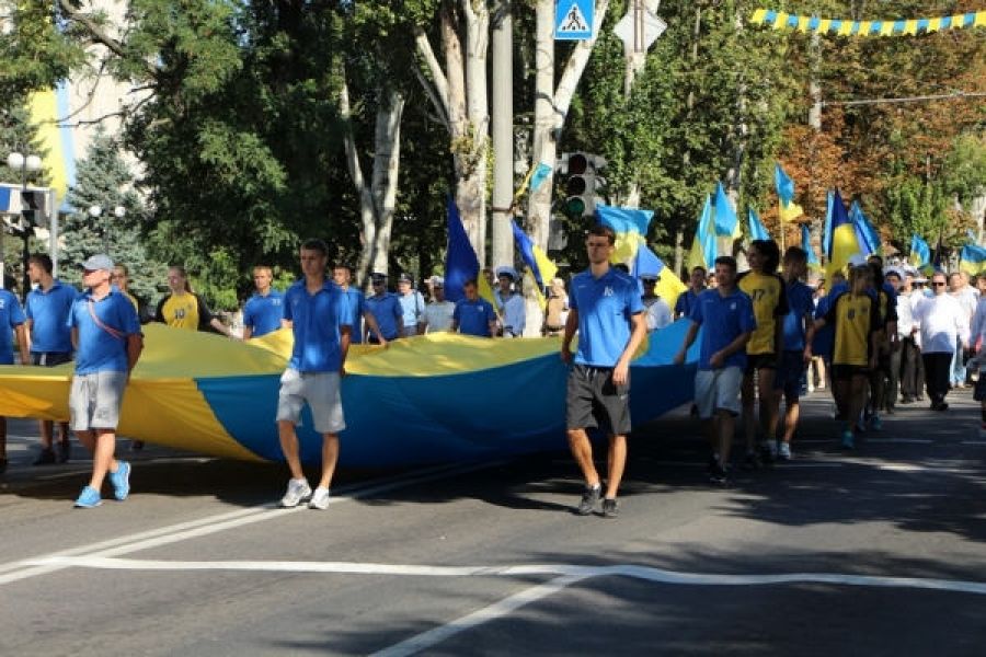 После официальной части, под звуки оркестра херсонцы под большим жёлто-голубым символом независимого государства прошлись центральным проспектом города.
