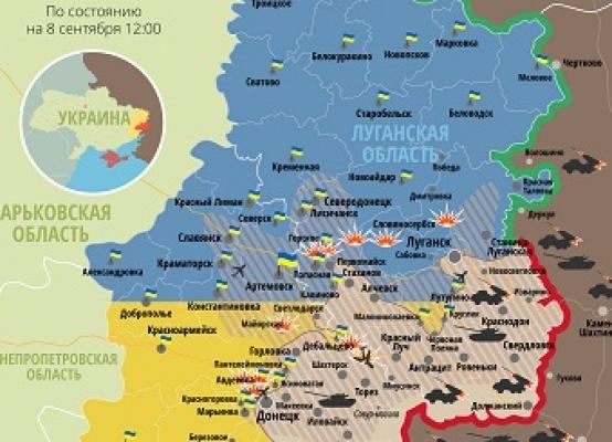 Совет национальной безопасности и обороны Украины опубликовал актуальную карту боевых действий в зоне АТО по состоянию на 8 сентября, 12:00.