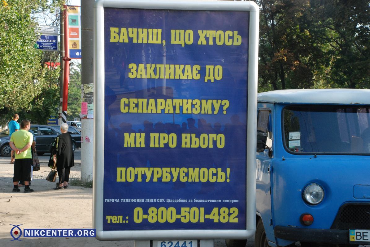 В Николаеве появились плакаты, призывающие граждан противостоять сепаратистским настроениям. Так, под призывом от имени СБУ: «Видишь, что кто-то призывает к сепаратистским настроям, мы позаботимся о нем», — дается телефон горячей линии центрального офиса СБУ в Киеве.