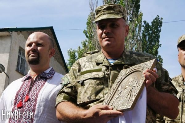 Одесский художник подарил бойцам АТО икону с ликом Святого Николая. Бизнесмен Вадим Твердохлебов из Южной Пальмиры изготовил святыню для наших солдат. Мастер по металлу отлил из огнеупорной латуни, которая не ржавеет, 8-килограммовую святыню, а на оборотной стороне выгравировал надпись "Спаси и сохрани". На днях по его просьбе икону передали командованию Николаевской 79-й отдельной аэромобильной бригады, в которой автор некогда служил, сообщает Комсомольская правда в Украине.