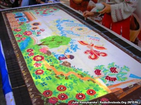 На гигантской шоколадке в технике петриковской росписи женщины изобразили пастушка, играющего на свирели, украинский дом с вербой и калиной, мельницу, разнообразие цветов и жар-птицу. Кондитерское изделие украсили надписью: "Днепр — это сердце Украины".