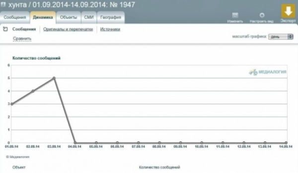 Так, по данным сервиса мониторинга СМИ, который подсчитывает количество упоминаний различных сроков в новостях, с 4 сентября на центральных российских телеканалах (Первый, Россия, НТВ, ТВЦ, РЕН, Пятый) — не было ни одного упоминания о «киевскую хунту»". При этом накануне этот термин был упомянут в новостях 5 раз.