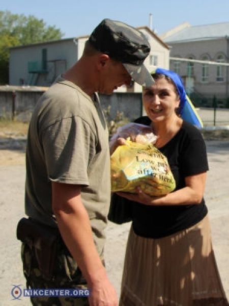 В Херсоне достаточно много неравнодушных людей. Сергей Рудыка частный предприниматель. Когда люди активно стали приносить продукты питания, одежду солдатам, он даже квартиру снял под склад. А в свободное время размещает в социальных сетях посты с просьбой о помощи армии. Так постепенно организовалось целое волонтёрское движение. Семейная пара Андрей и Маргарита заправляют свою машину за свой счёт, вешают жёлто-голубой флаг и выходными колесят по территориальным батальонам нашей области. Также помогают развозить вещи переселенцам из Донецка и Луганска. С ними мы познакомились на обратном пути в Херсон. «У меня подруга, мать четырёх детей. Она наволочки пошила на подушки, чтобы солдатам сны хорошие снились», — говорит Рита.