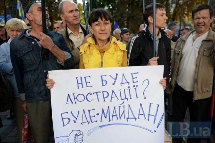 Активисты держат плакаты "Требуем люстрации", "Майдан не простит, майдан требует" и прочие.