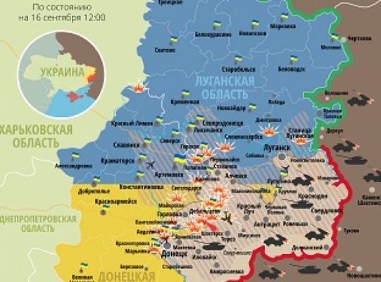 Совет национальной безопасности и обороны Украины опубликовал актуальную карту боевых действий в зоне АТО по состоянию на 16 сентября, 12:00.