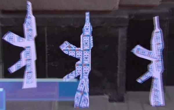 Участники акции принесли под стены СБУ картонные автоматы, на которых было написано "Вести", а также экземпляры газет, на которых, по их мнению, содержатся антиукраинские выражения.