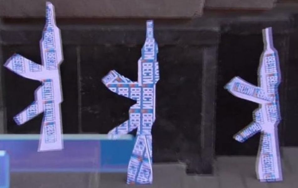 Участники акции принесли под стены СБУ картонные автоматы, на которых было написано "Вести", а также экземпляры газет, на которых, по их мнению, содержатся антиукраинские выражения.