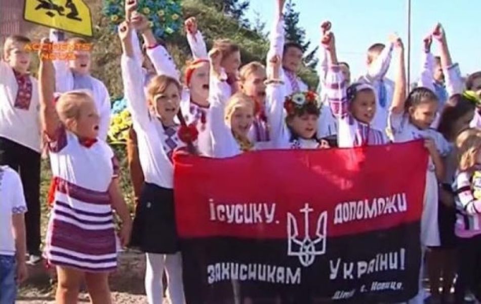 На видео видно, как дети в вышиванках и с флагами в руках поют гимн Украины. В руках у детей красно-черное знамя, на котором написано "Иисус, помоги защитникам Украины. Дети с. Новица".