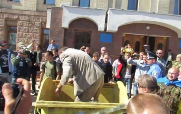 Протестующие бросили в мусорный бак депутата Кировоградского облсовета Николая Корецкого, в пятницу, 19 сентября, в Кировограде.