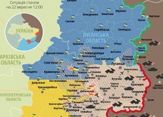 Совет национальной безопасности и обороны Украины опубликовал актуальную карту боевых действий в зоне АТО по состоянию на 22 сентября, 12:00.