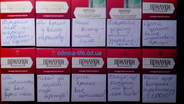 Например, одесситы придумали несколько оригинальных способов отправлять приятные весточки бойцам. Волонтерская сотня Далии Северин, собирая посылки для бойцов, обязательно вкладывает в них носки с записочками. Причем, каждый раз стараются, чтобы записки были разные.