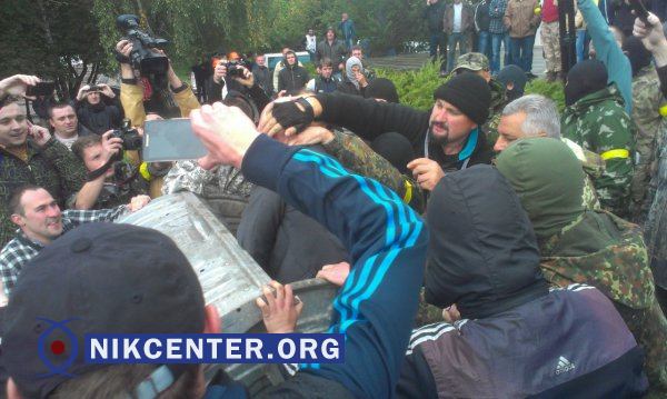 После начала заседания облсовета через некоторое время активисты насильно вытолкали из сессионного зала Александр Данильчук и бросили его в мусорный бак.