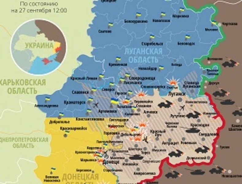 Совет национальной безопасности и обороны Украины опубликовал актуальную карту боевых действий в зоне АТО по состоянию на 27 сентября, 12:00.
