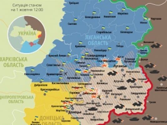 Совет национальной безопасности и обороны Украины опубликовал актуальную карту боевых действий в зоне АТО по состоянию на 1 октября, 12:00.