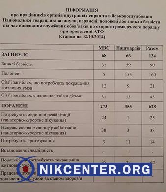 В частности, по состоянию на 2 октября 2014 года при исполнении служебных обязанностей погибли 68 сотрудников МВД и 66 бойцов Нацгвардии. Еще 90 человек пропали без вести и 160 попали в плен.