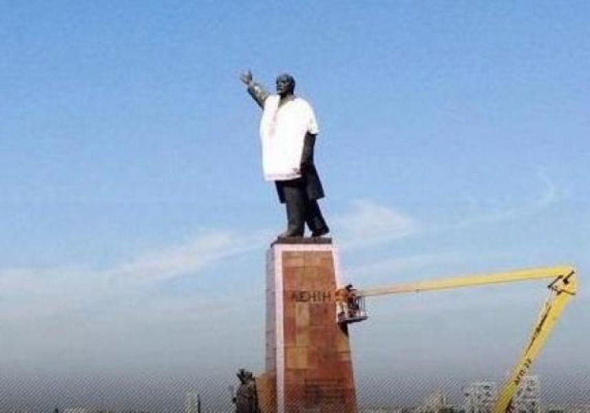 Памятник Ленина в Запорожье переодели в украинскую вышиванку, сообщает Корреспондент.net.
