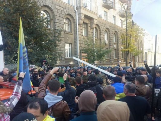 Когда митингующие пытались прорваться к самому зданию Администрации им на пути встала милиция и батальоны "Киев-1". Завязалась потасовка.