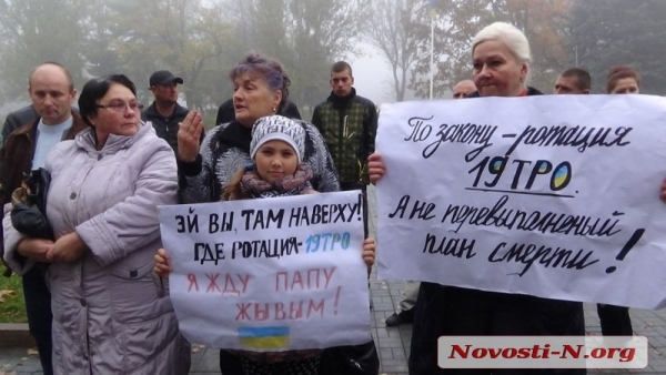 Утром 22 октября под Николаевскую областную государственную администрацию пришли с пикетом матери и жены военнослужащих 19-го батальона территориальной обороны, находящихся сейчас в зоне АТО. Их требование заключалось в одном — провести ротацию, чтобы бойцы имели возможность приехать домой отдохнуть.