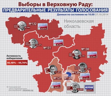 По результатам обработки 32,36% протоколов по состоянию на 10:00, в 5 николаевских округах лидирует партия «Блок Петра Порошенка», а в 128 избирательном округе – политическая партия «Оппозиционный блок».