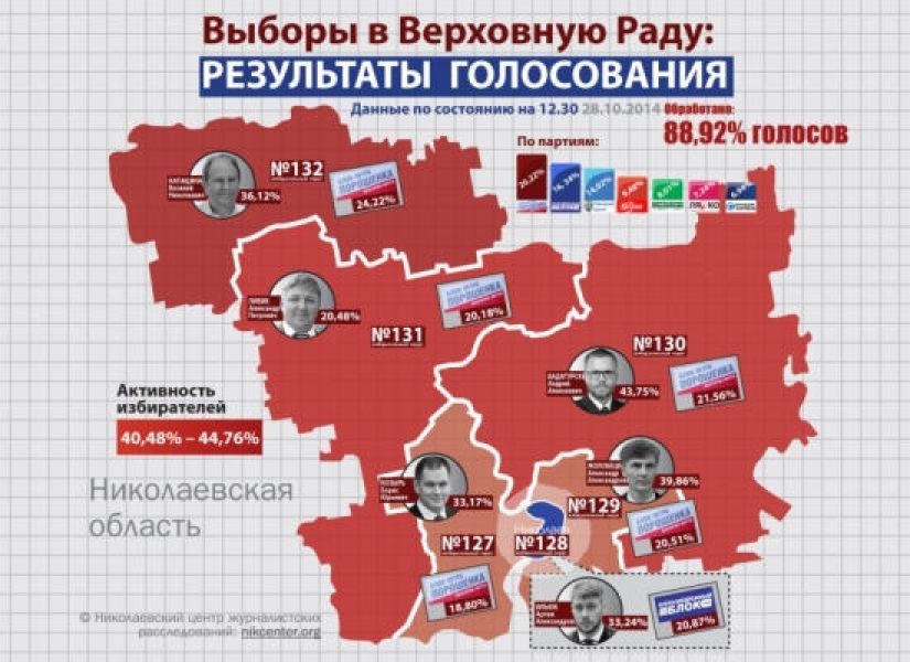 По результатам обработки около 89,03% протоколов по состоянию на 12:30, в 5 николаевских округах лидирует партия «Блок Петра Порошенка», а в 128 избирательном округе – политическая партия «Оппозиционный блок».