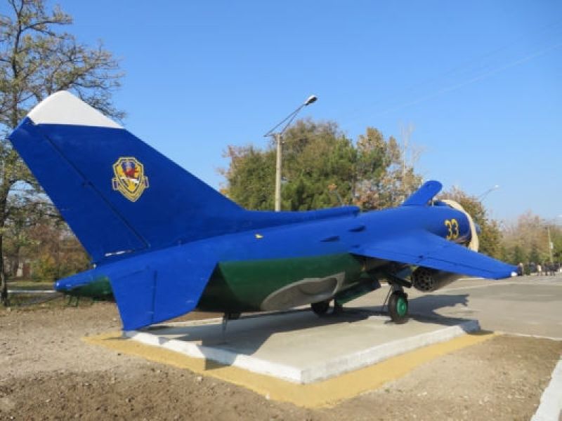 На бетонном постаменте авиаторы установили настоящий самолет советской палубной авиации Як-38. Это один из многих военных самолетов который обучали эксплуатировать в 33 Центре боевой подготовки и переучивания летного состава авиации ВМС им.Преображенского.