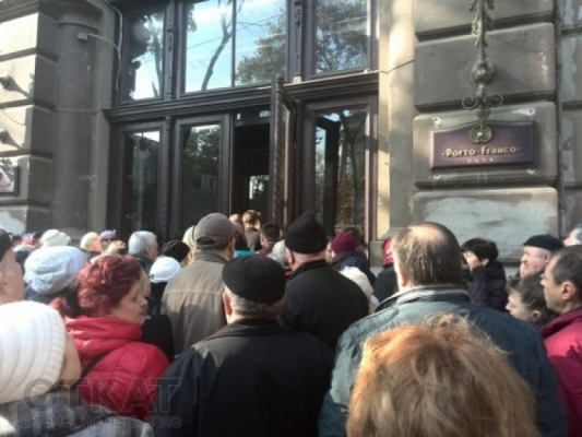 Около 50-ти человек утром в понедельник, 3 ноября, заблокировали вход в банк «Порто-Франко» на перекрёстке улиц Пушкинской и Греческой и требовали вернуть им вклады.